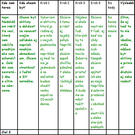 V tabuľke máte jeden vzorový príklad, podľa ktorého si môžete stanoviť svoj cieľ. Môžete sa ním inšpirovať, ale samozrejme, každý jeden človek ma iné ciele, alebo k tomu istému cieľu môžu viesť iné kroky.