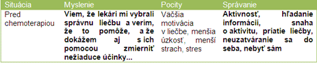 - Keď sa dostanete do situácie, v ktorej ste zvykli mávať nepríjemné myšlienky, ako napríklad pred chemoterapiou, či počas čakania na výsledky, budete viac pripravení použiť tieto pozitívne myšlienky, ktoré následne zmiernia nepríjemné pocity úzkosti, strachu. Možno bude trvať dlhšie kým sa vám to podarí, ale ak vytrváte, máte šancu znížiť svoju úzkosť, strach, stres a zvýšiť aktívnosť a pozitívne nastavenie k liečbe, k okoliu a hlavne k sebe samému.